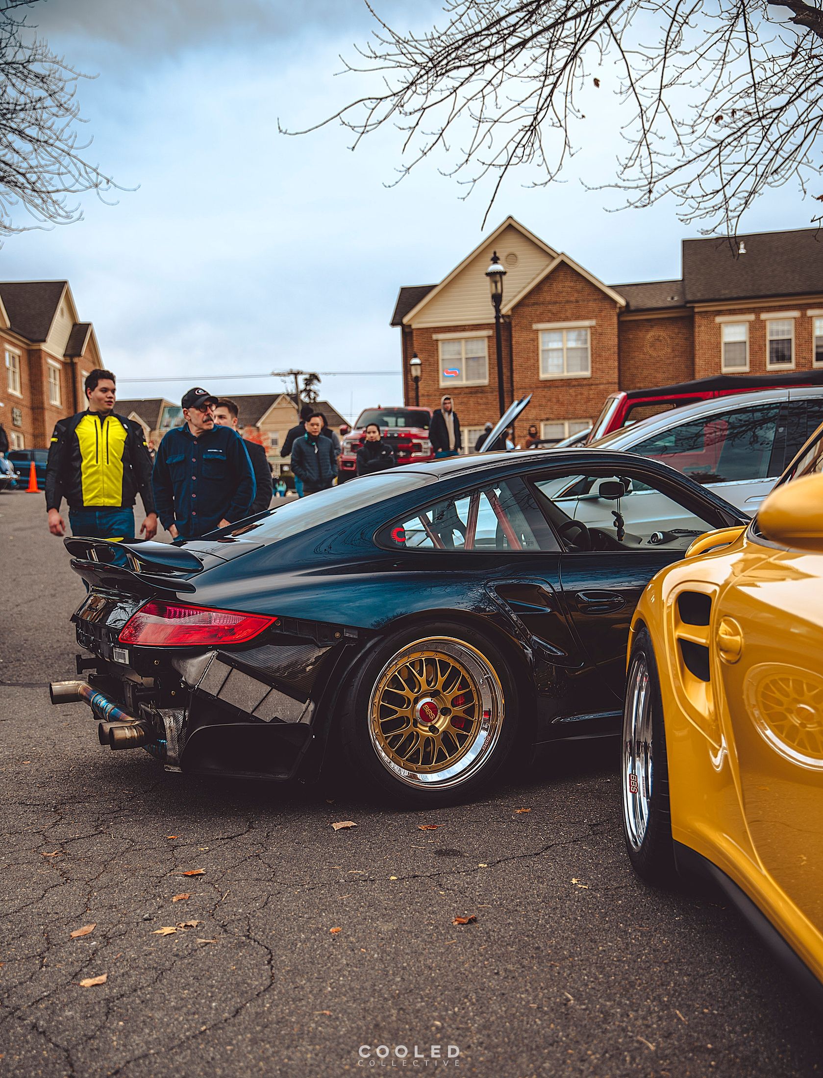 Also good to see Ali and Xavier hard parked reppin' the BBS e88s on their 997 Turbos. Speed yellow and Midnight blue look really good together. Ali had his bumper off today because he was trying to trace a leak but also exposing that Ti exhaust.... nom.