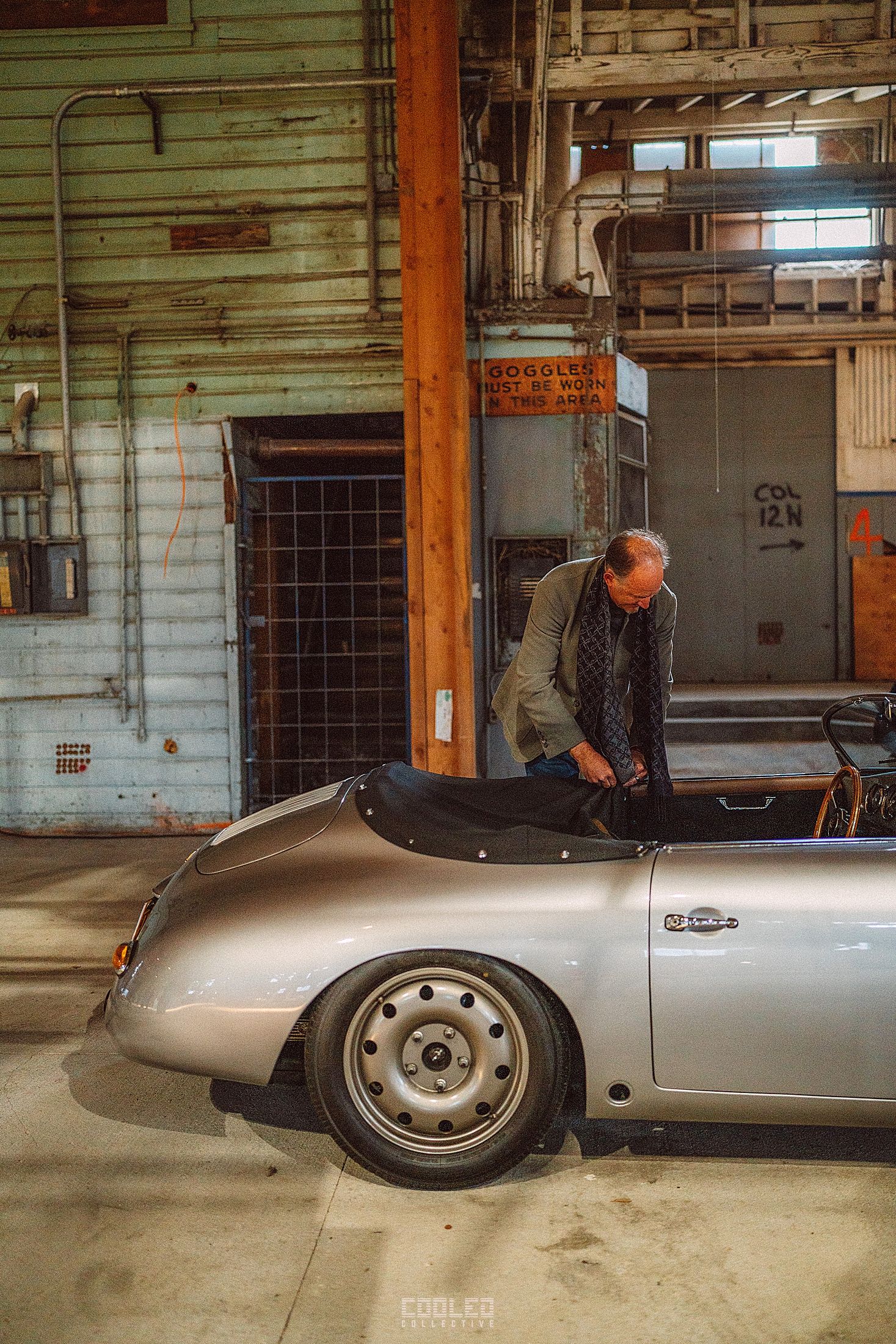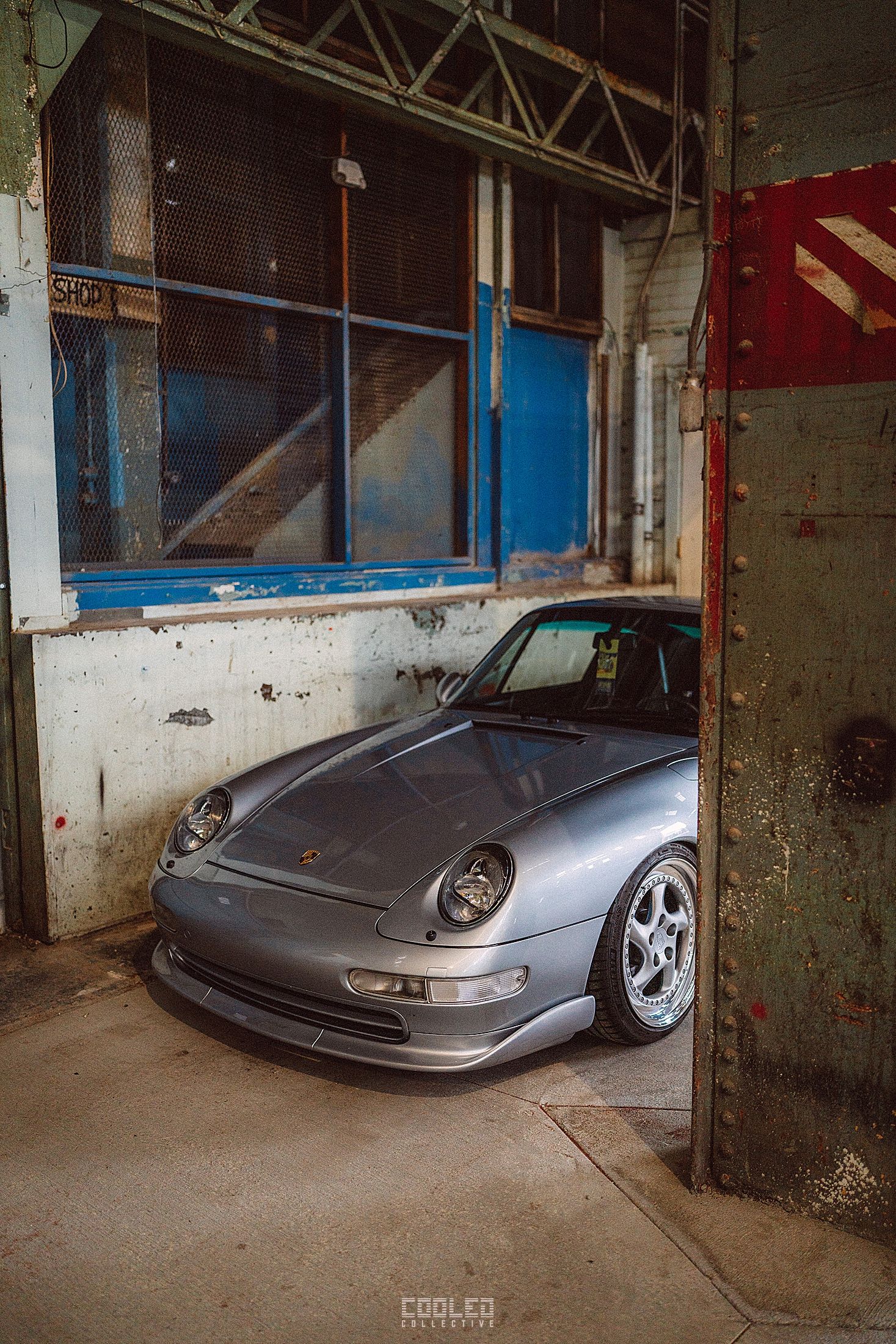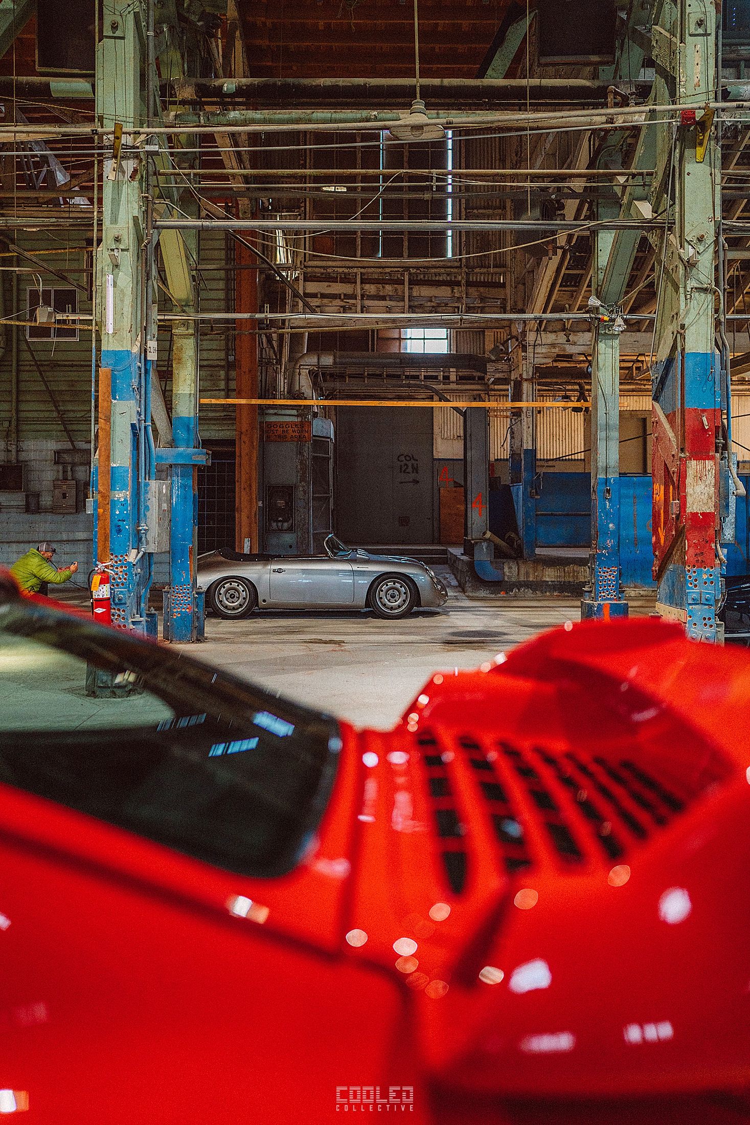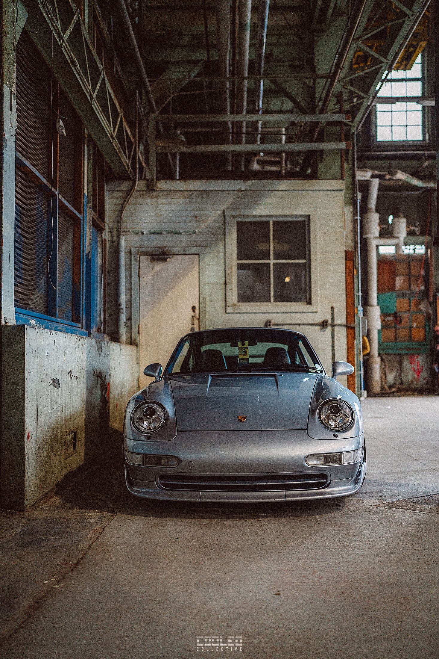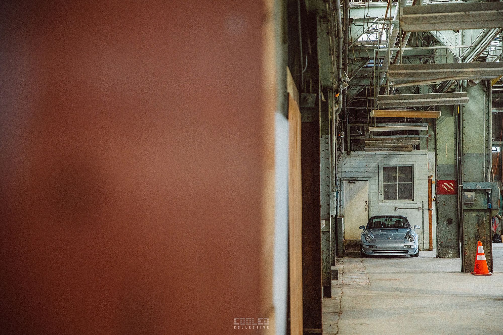 After a good 30 mins of shooting the yard, I ended up finding the gem of the show. A long and narrow warehouse where they probably built the naval ships. This space is everything a photographer longs for. High vaulted windows, lots of textures and colors, wide open space, large doors to control light.... just a sweet magical place. First car I see inside is John's 993 tucked away in a corner spot. A great spot if you ask me.